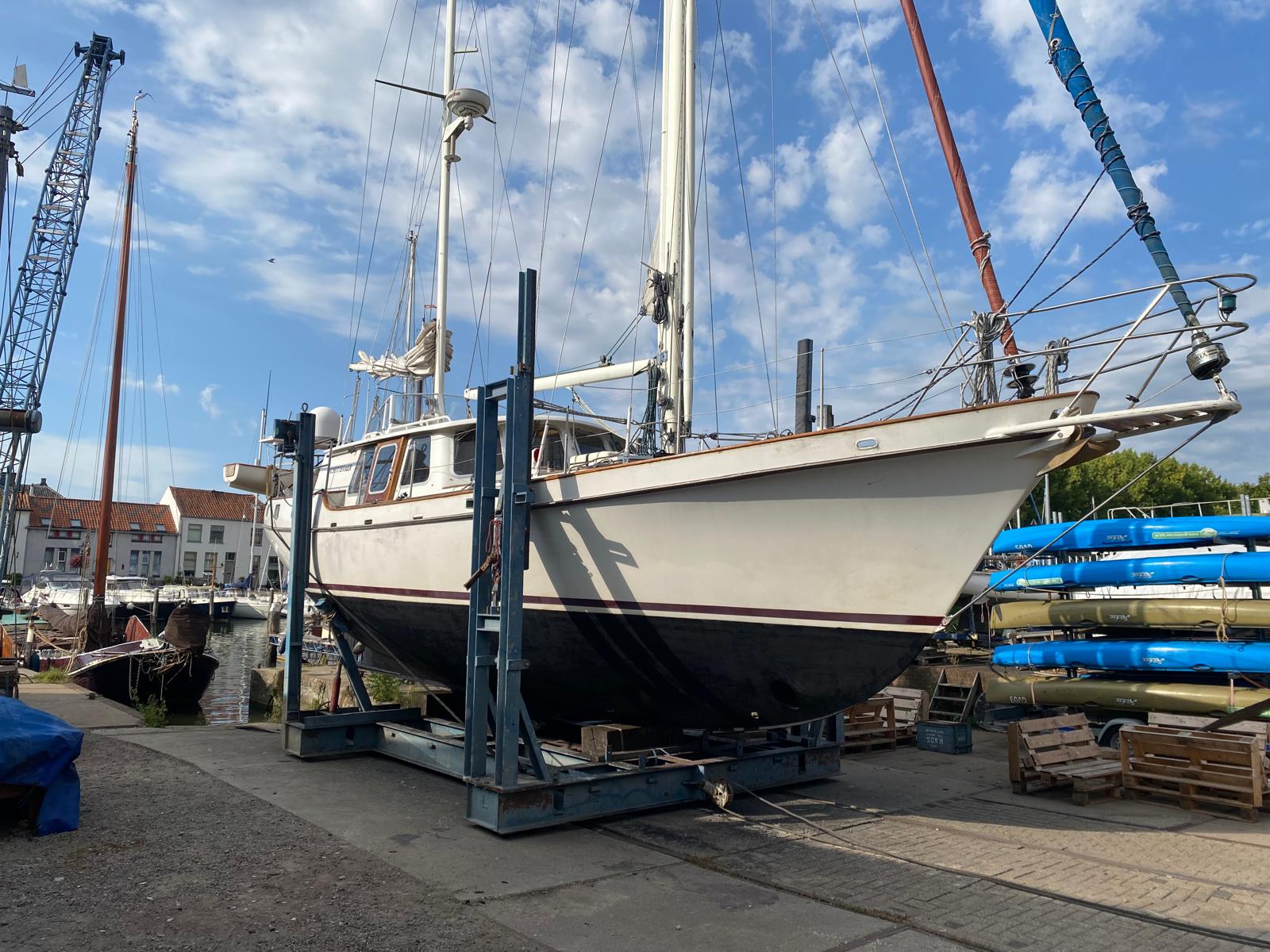 gewone schoten en vol uitgerolde bruine fok, zeilt prima en rust, weinig